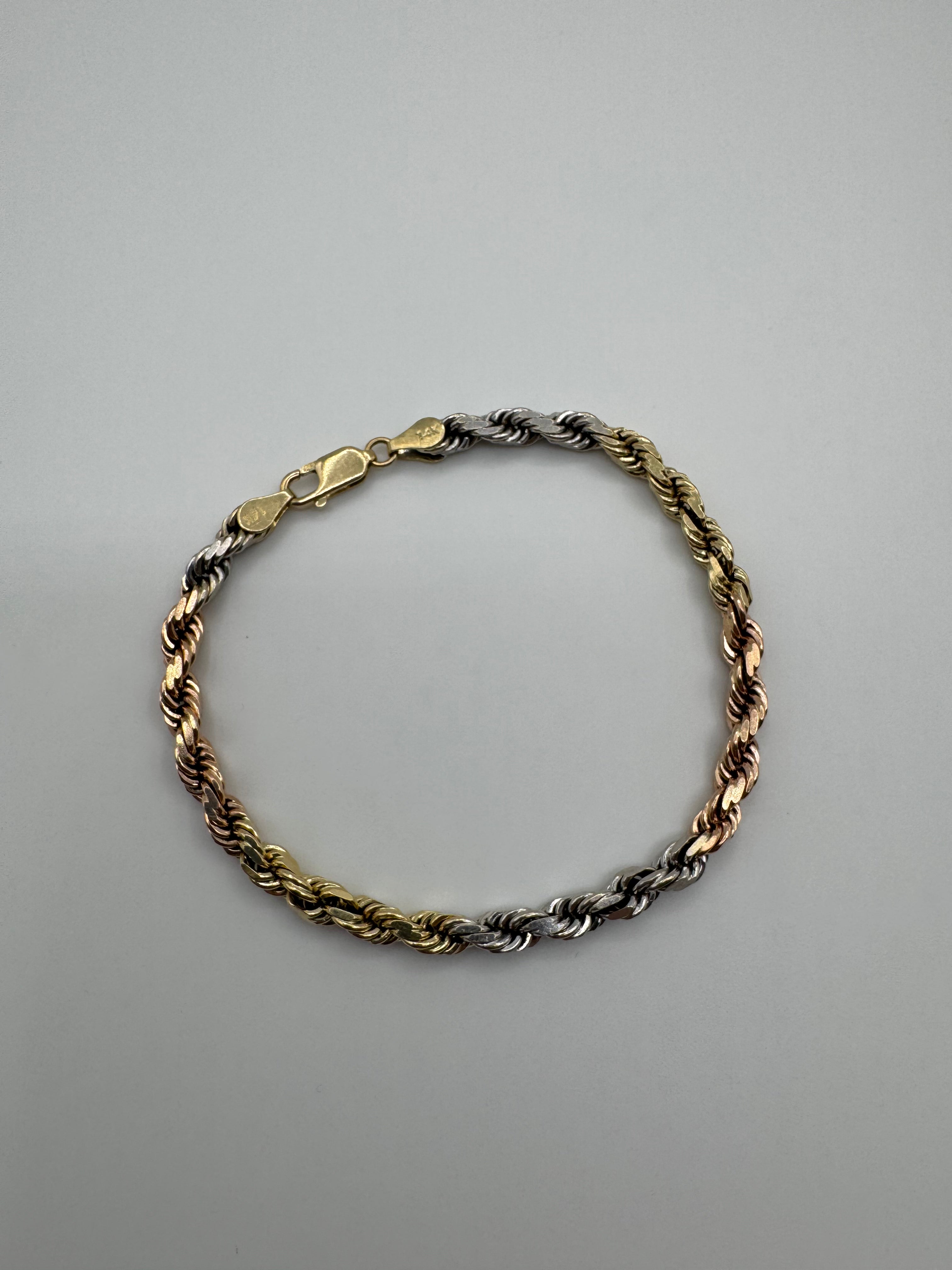 AUTHENTICATION NOTES: BRACELET IS IN MINT CONDITION. POLISH AND SHINE ARE GOOD. BRACELET IS SOLID GOLD. NATURAL 14KT TRI COLOR GOLD COLORING. PURITY IS 14KT PER XRF.