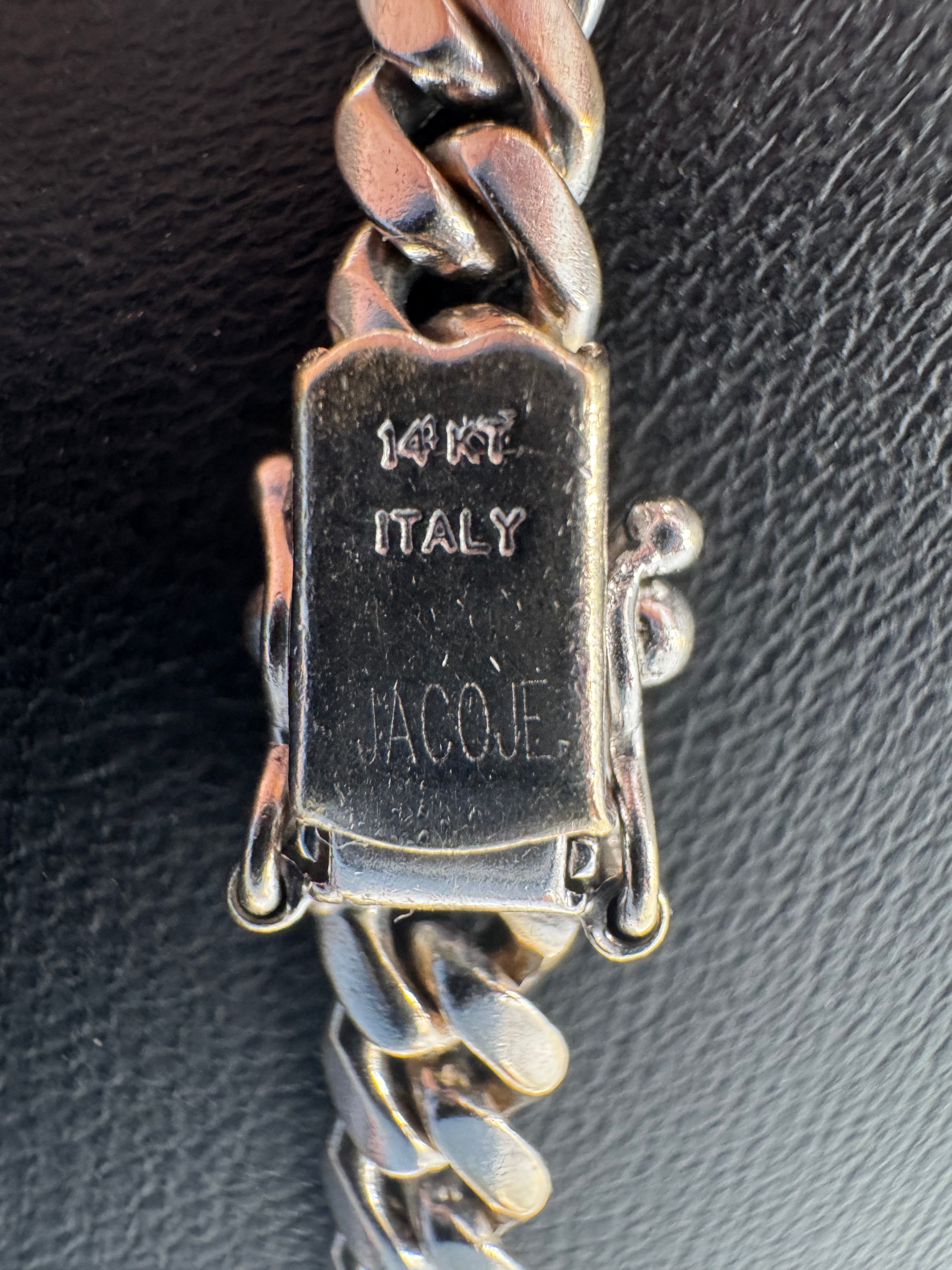 AUTHENTICATION NOTES: CHAIN IS USED. CHAIN IS IN MINT CONDITION. POLISH AND SHINE ARE GOOD. CHAIN IS SOLID GOLD. NATURAL 14KT WHITE GOLD COLORING. PURITY IS 14KT PER XRF.