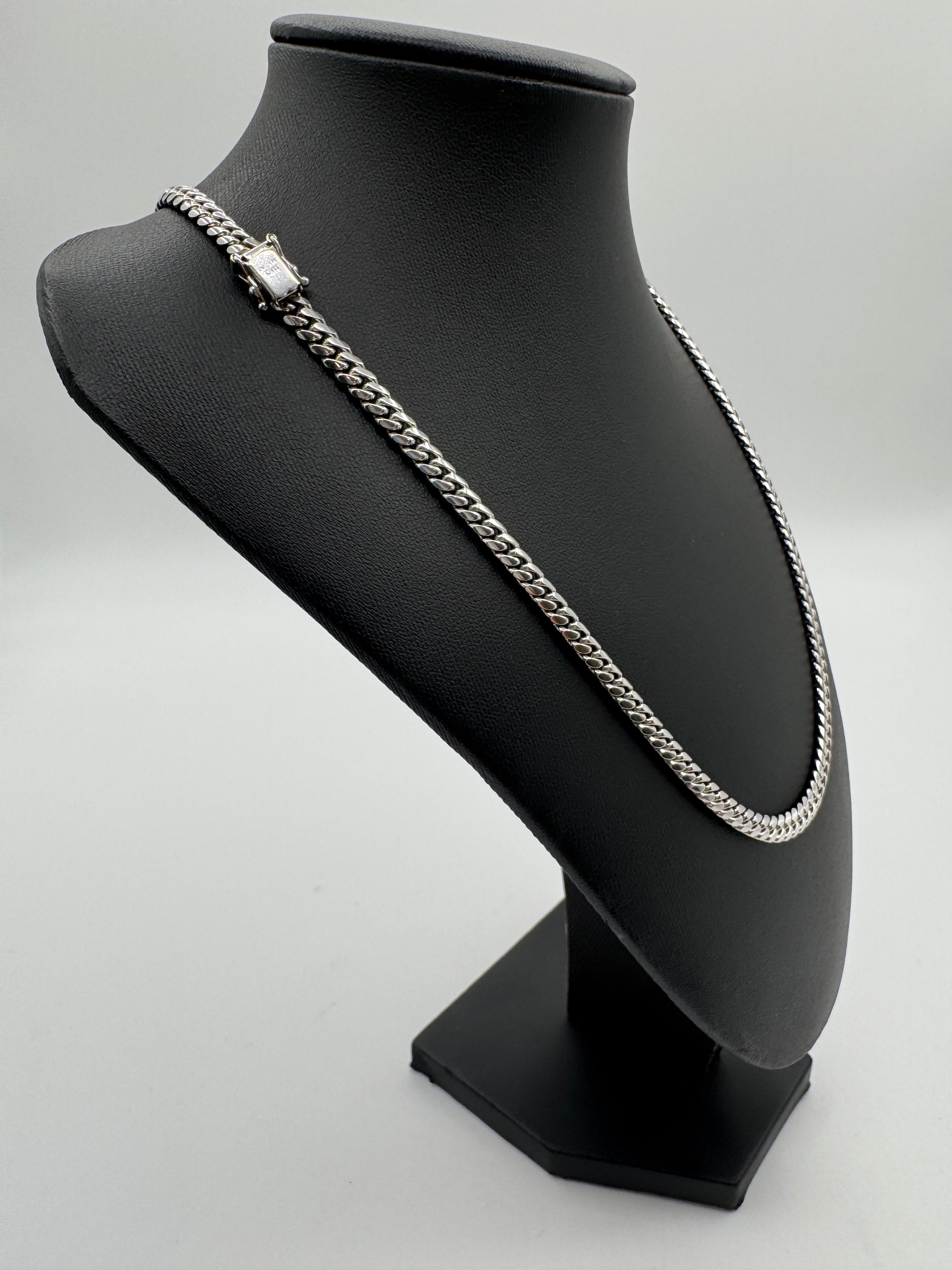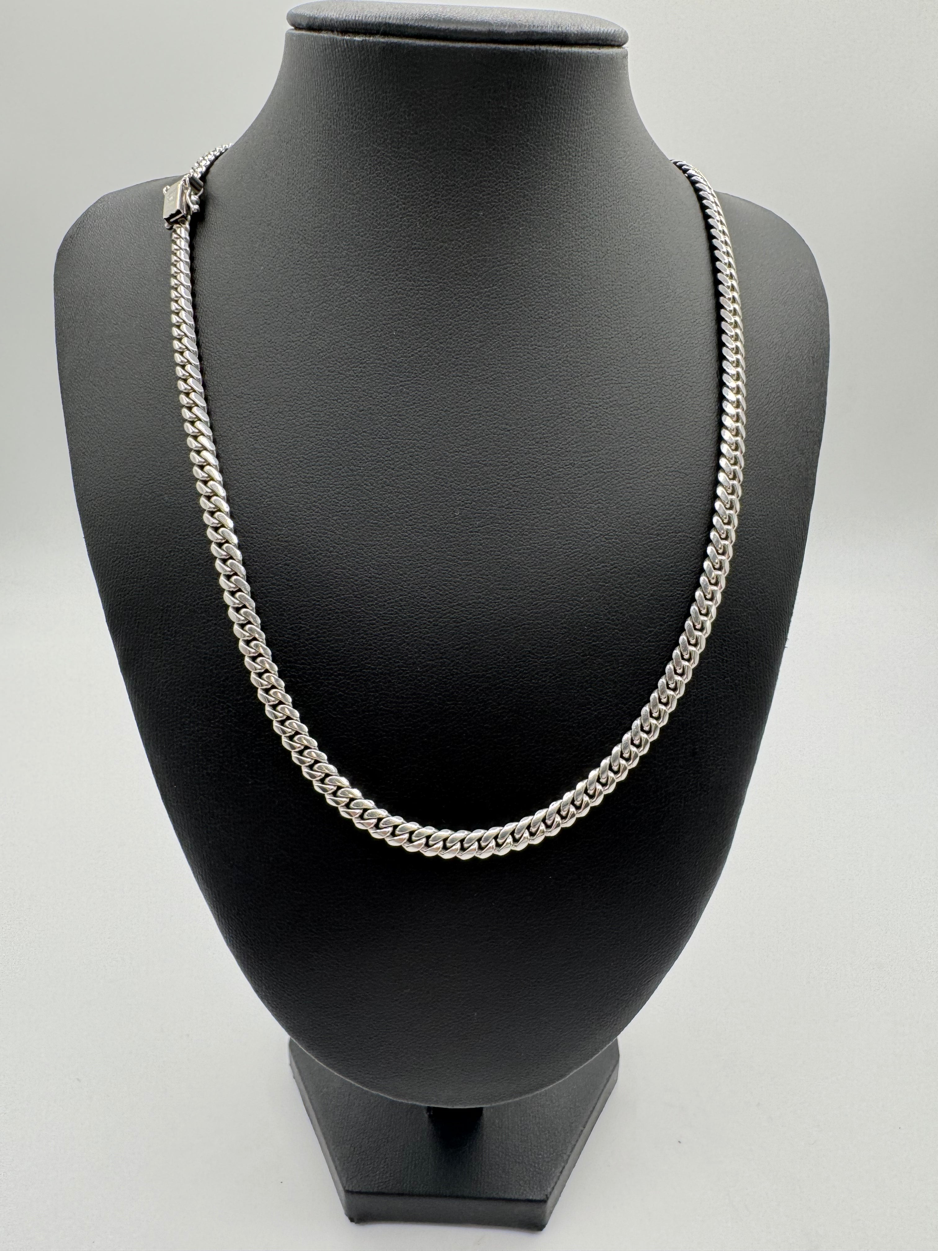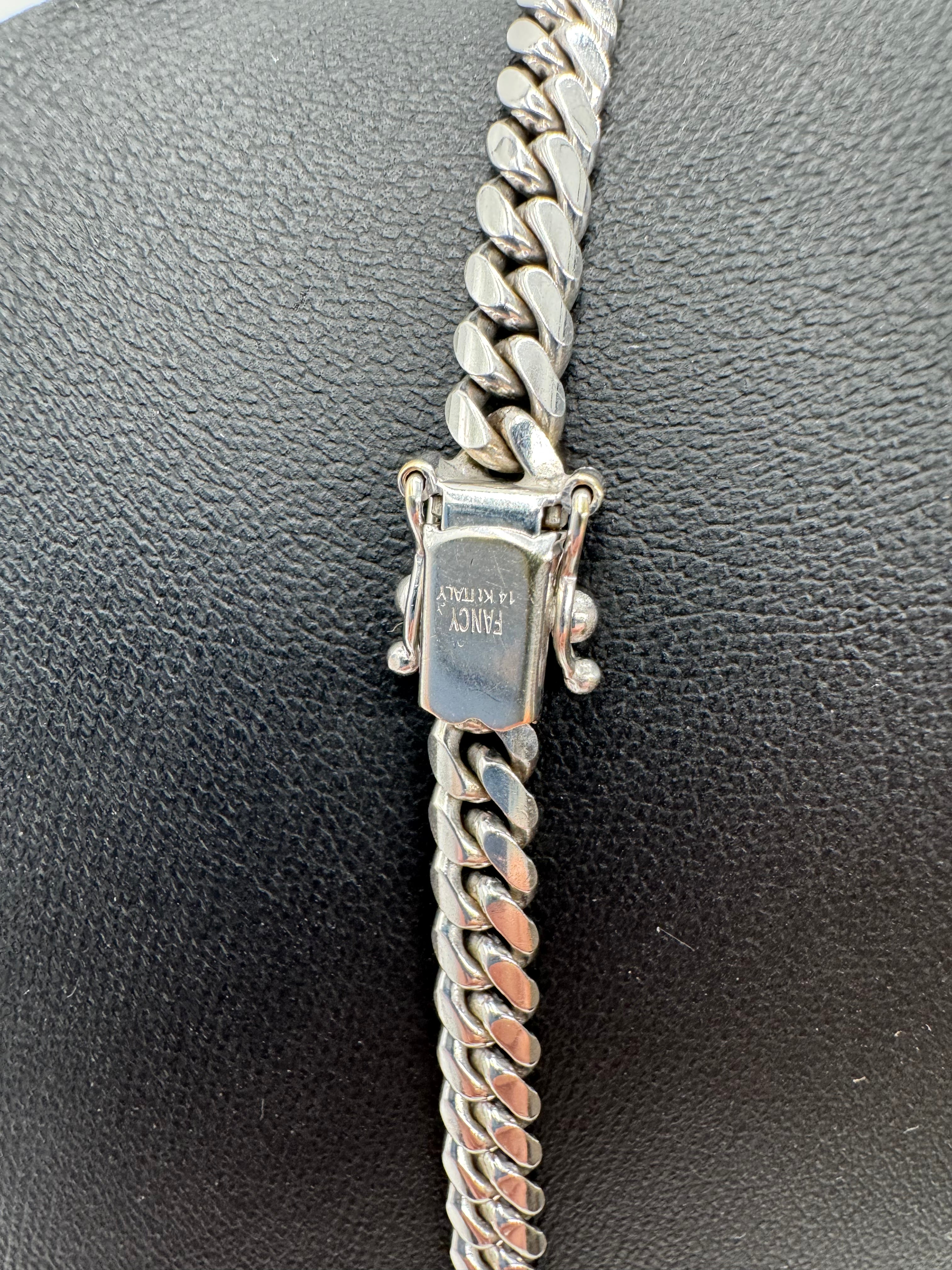 AUTHENTICATION NOTES: CHAIN IS USED AND IN MINT CONDITION. POLISH AND SHINE ARE GOOD, LIGHT WEAR ON BOX LOCK. CHAIN IS SOLID GOLD. NATURAL 14KT WHITE GOLD COLORING. PURITY IS 14KT PER XRF.